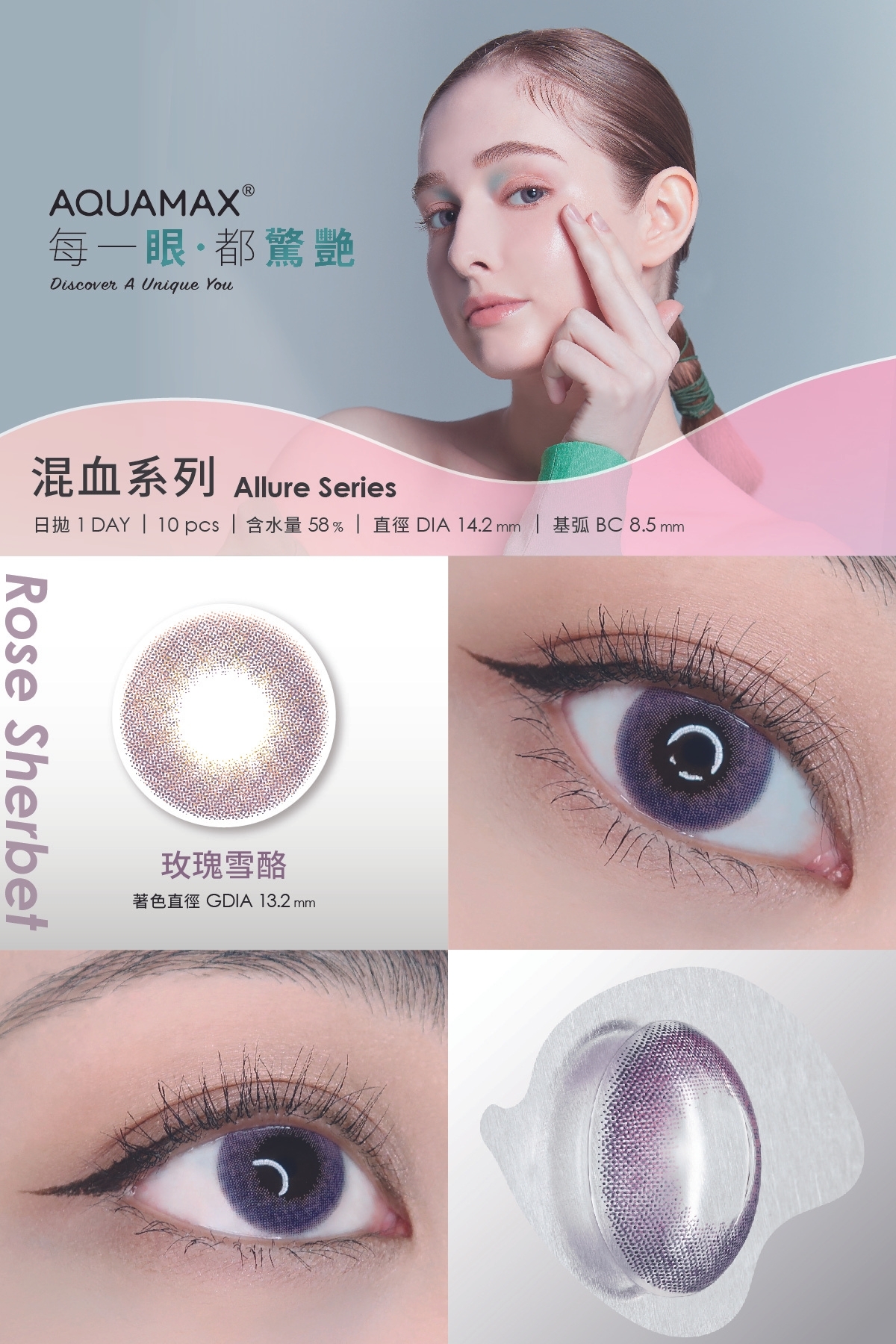 用獨特的眼光看世界 aquamax是來自充滿樂情創意的美國加州品牌. 保存液添加PMB長效保濕因子讓您舒潤一整天。玫瑰雪酪ROSE SHERBET粉與紫色交錯漸層,夢幻且華麗,自帶氣場,化身目光焦點。