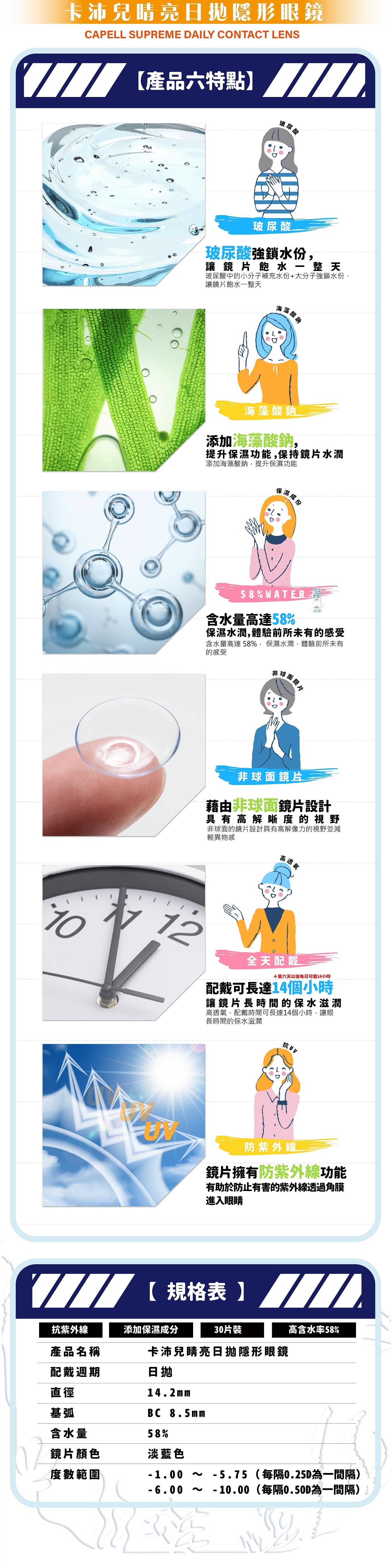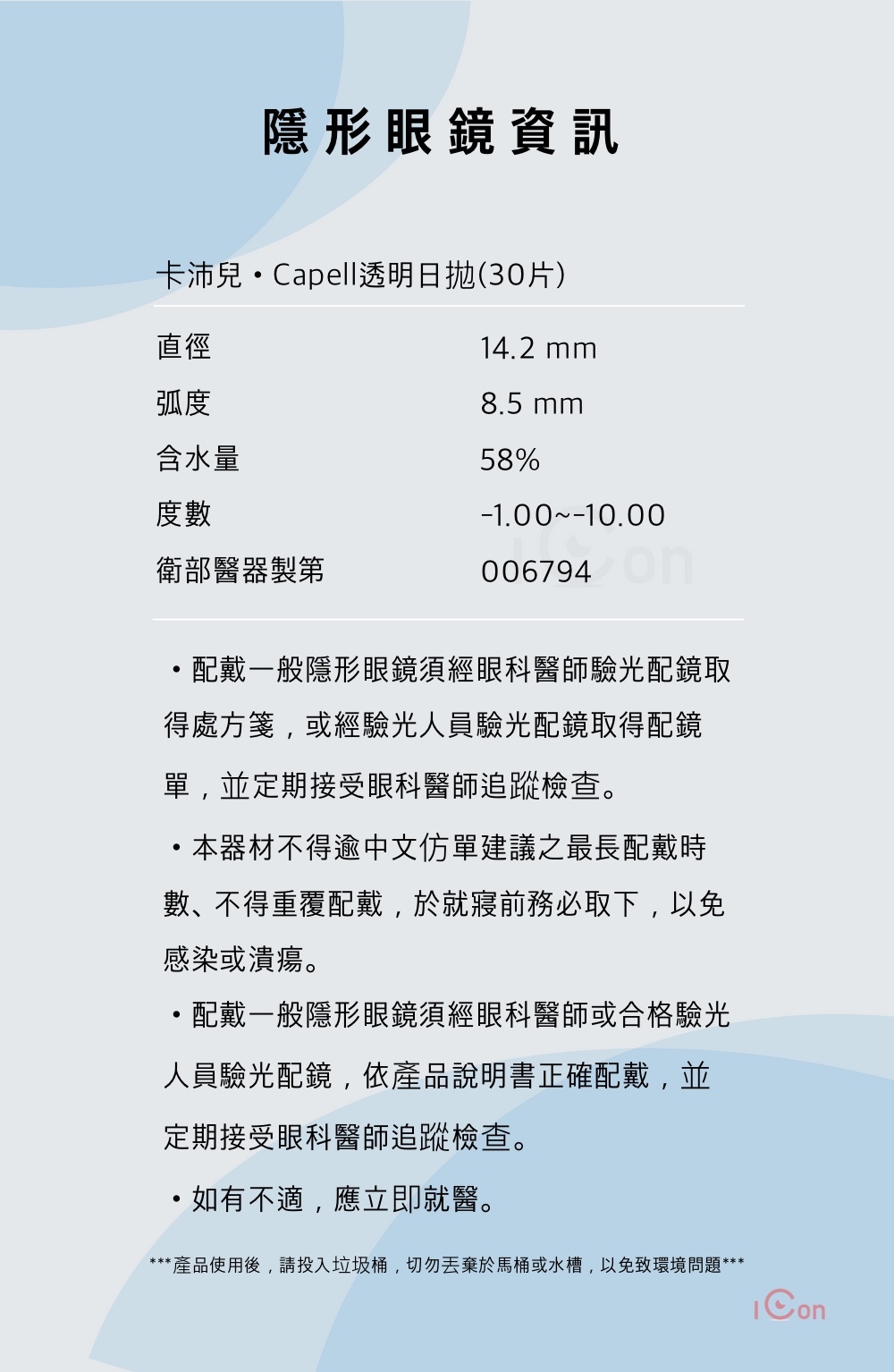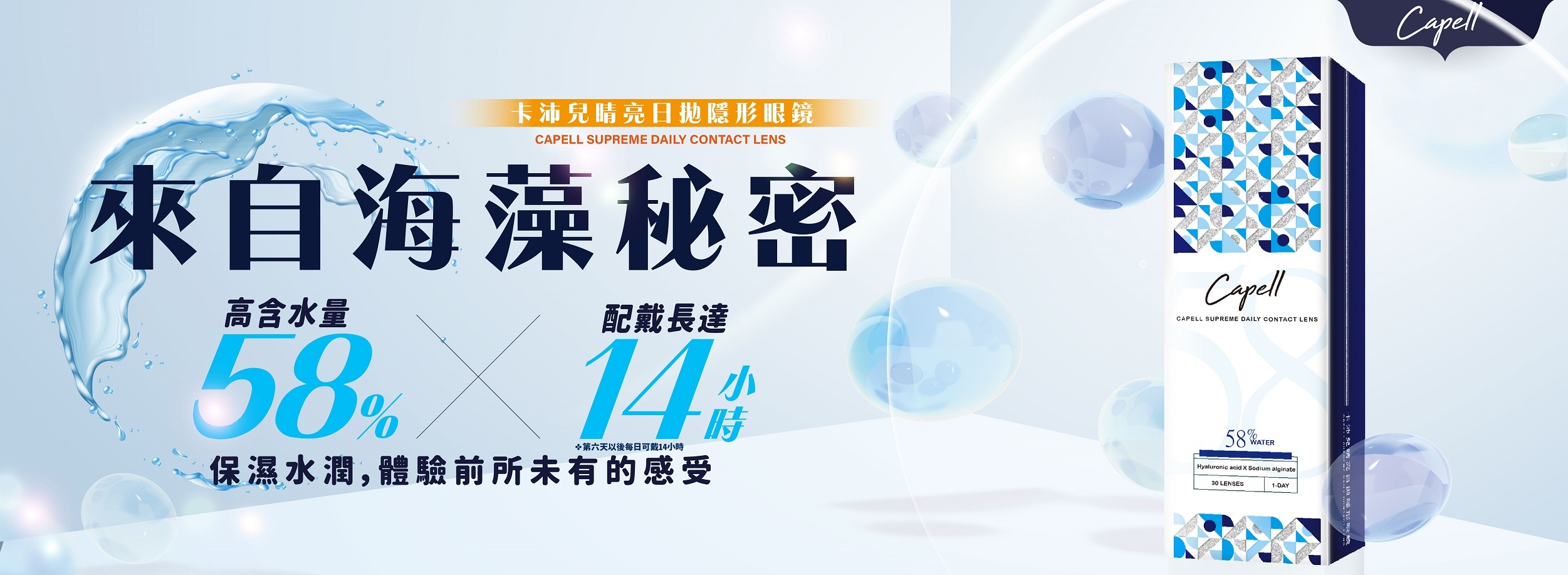 Capell卡沛兒睛亮透明日拋,玻尿酸強鎖水份,讓鏡片飽水一整天,添加海藻酸鈉,提升保濕功能,保持鏡片水潤,體驗前所未有的感受。藉由非球面鏡片設計,具有高解析度的視野!