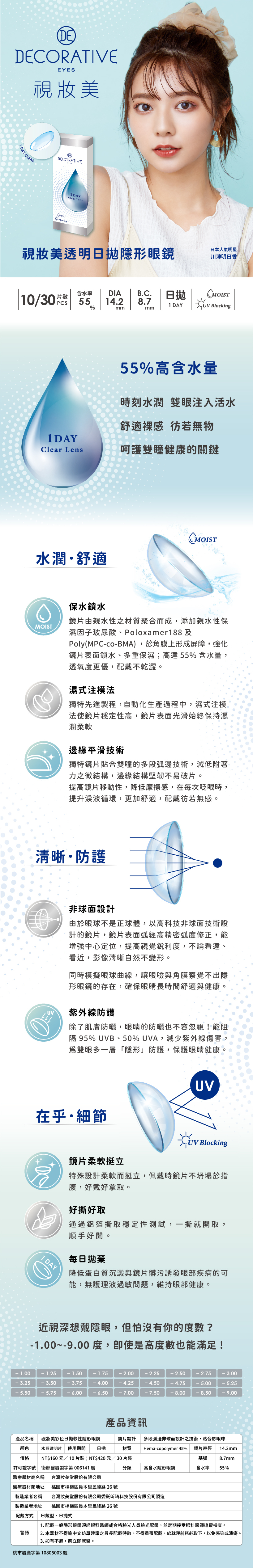 日本隱形眼鏡品牌視妝美55%含水率日拋透明隱眼,配戴不乾澀。鏡片配方中添加UV 吸收劑具抗紫外線效果,可阻擋部分紫外線經角膜射入眼睛,在陽光下能保護眼睛減少紫外線傷害,可有效過UVA 50%及UVB 95%以上。日拋優勢,那就是不用做後續的保養,每天戴完即丟,不用擔心鏡片上殘留油脂、髒污、過敏原等,降低眼睛受到感染泛紅的風險。