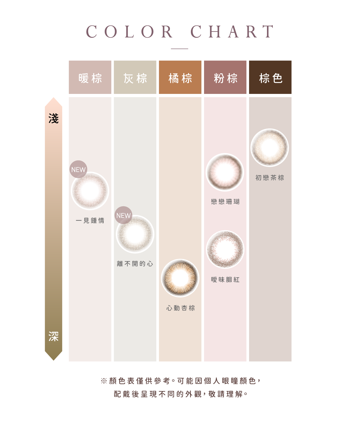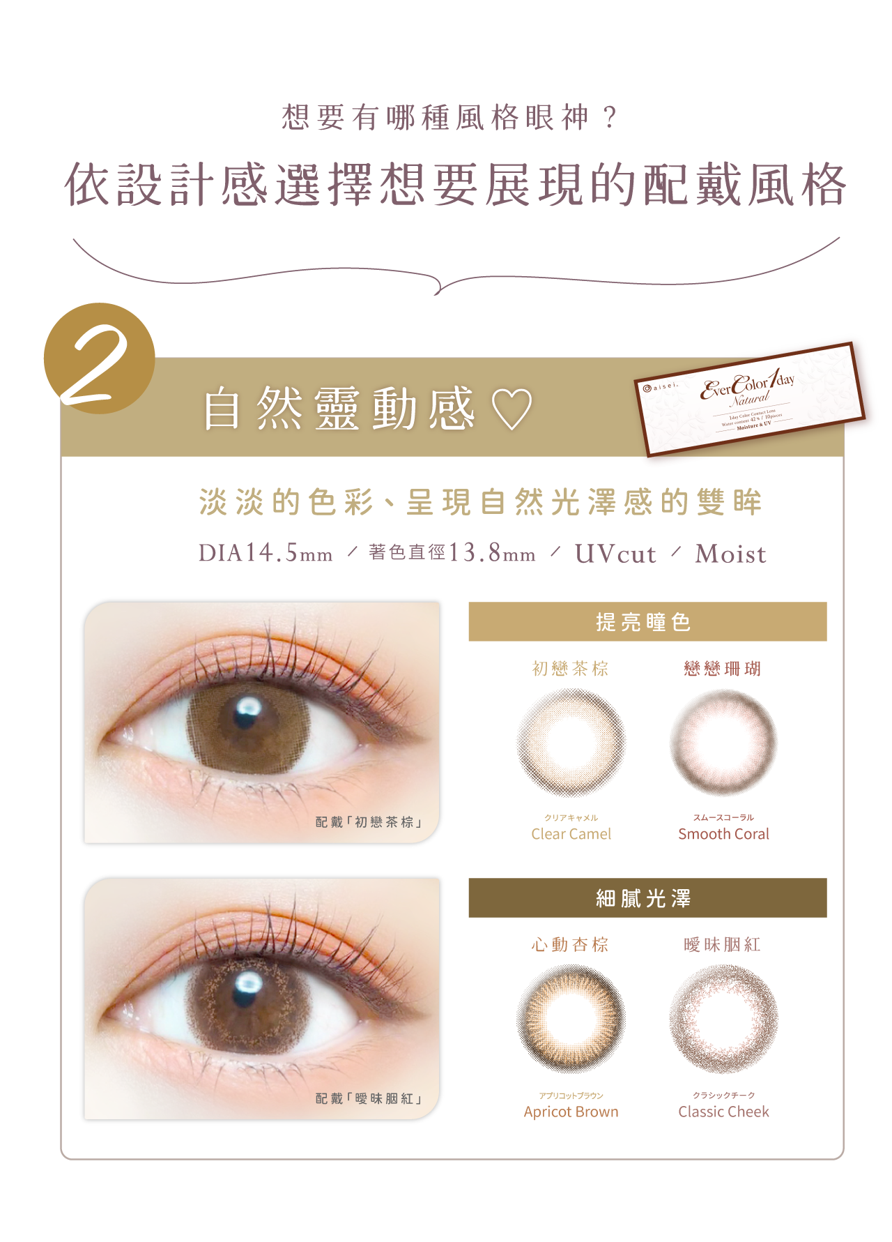 來自日本的美瞳,流行風靡全亞洲!由新木優子Yuko Araki代言,人氣美瞳品牌Ever Color 1day!追求日本女生的精緻感!透明感X高顯色,配戴之後直接讓眼神立體起來,既顯色又能與原生瞳色和諧融入!號稱日本匠人級的設計,讓妳天天都能散發不同的時髦氛圍感。NATURAL系列呈現自然靈動感,悄悄展現眼睛的美!【戀戀珊瑚smooth coral】水光粼粼的小鹿眼,黑棕色邊框讓眼睛看起來更立體有神,內圈的珊瑚粉突顯出明亮可愛的氛圍。