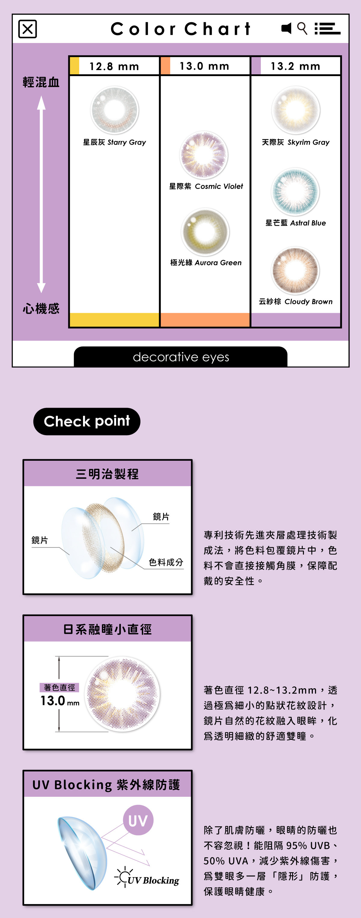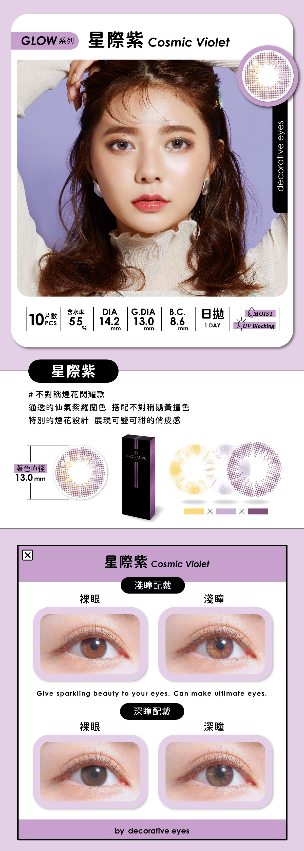 星際紫cosmic violet 通透的仙氣紫羅蘭色,搭配不對稱鵝黃撞色,融瞳自然小直徑可鹽可甜。不對稱煙火閃耀款,通透的仙氣紫羅蘭色,搭配不對稱鵝黃撞色,特別的煙火設計,展現可鹽可甜的俏皮感!