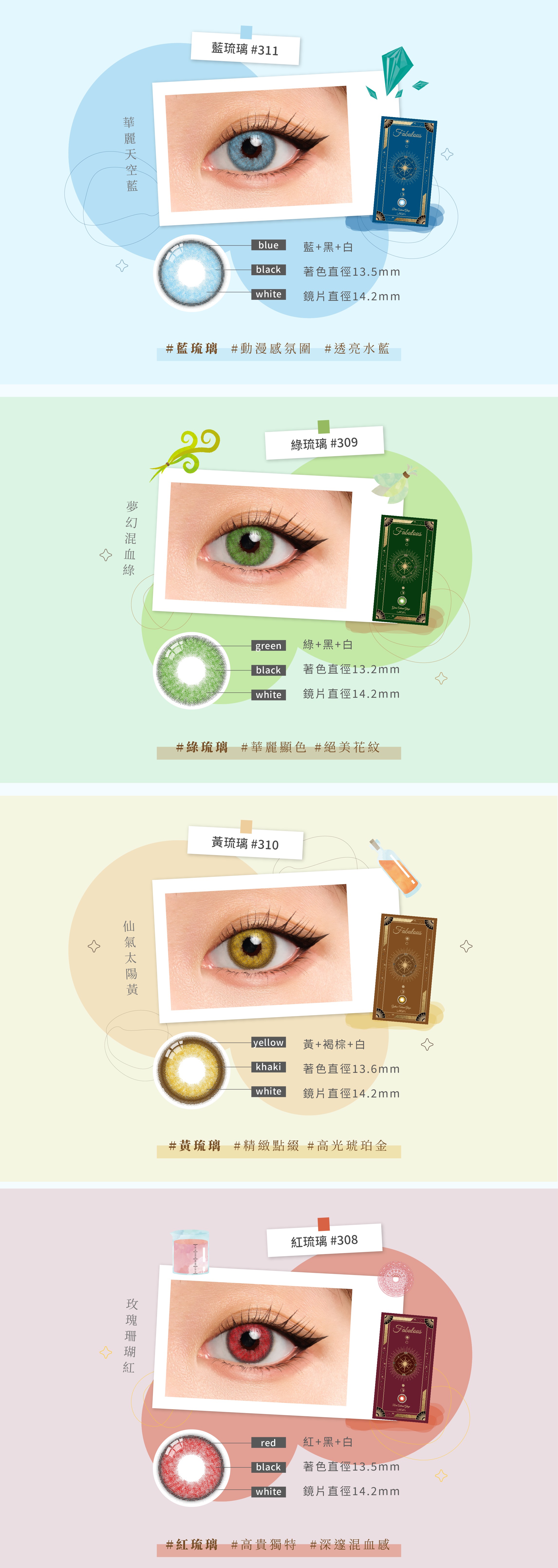 奇幻系列以四大元素 「水/藍色、風/綠色、土/黃色、火/紅色」進行配色,