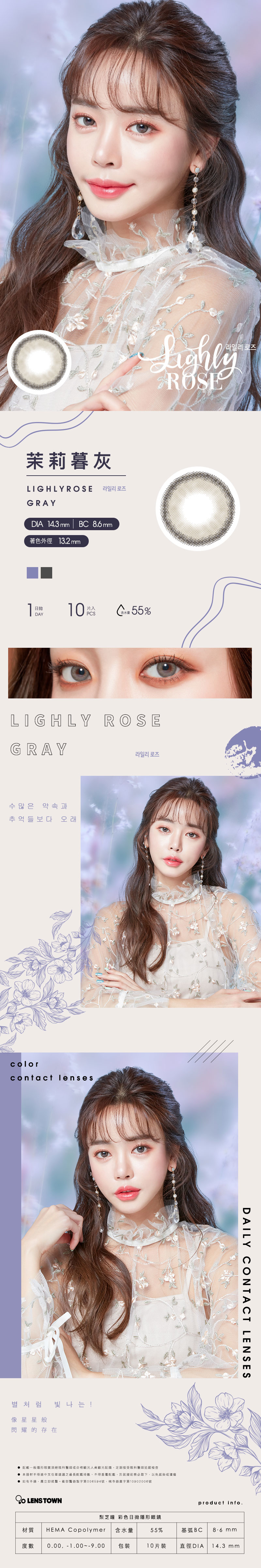 韓國超人氣隱形眼鏡品牌lenstown,韓國官方授權,台灣獨家代理!茉莉灰lighlyrose gray獨特明豔的沉靜氣韻,簡單配色卻不失細膩度。採用優雅外圈的線條,讓細節中更見含蓄低調的品味。自然的融入瞳色,輕混血空靈感GET!