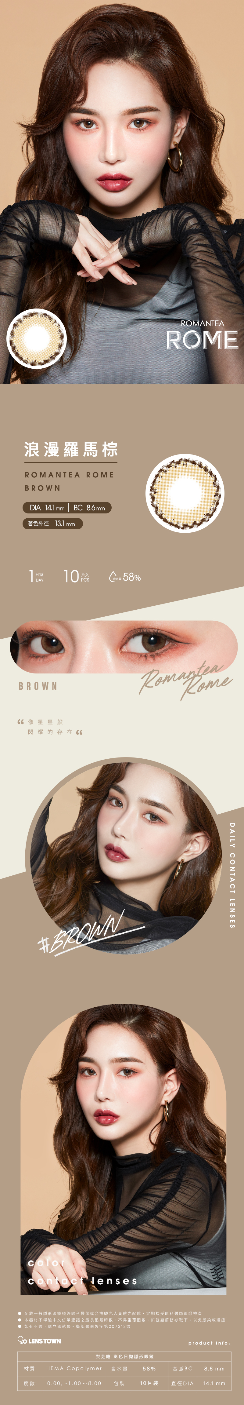 韓國超人氣隱形眼鏡品牌lenstown,韓國官方授權,台灣獨家代理!由韓國金請夏推薦,我的城市風格Romantea Rome ,熱銷魅力小直徑日拋!浪漫羅馬棕Romantea Rome,柔和的棕色外圈,融合內圈的質感色系,自然呈現深邃的琉璃光澤,如羅馬城市般的自由及浪漫!
