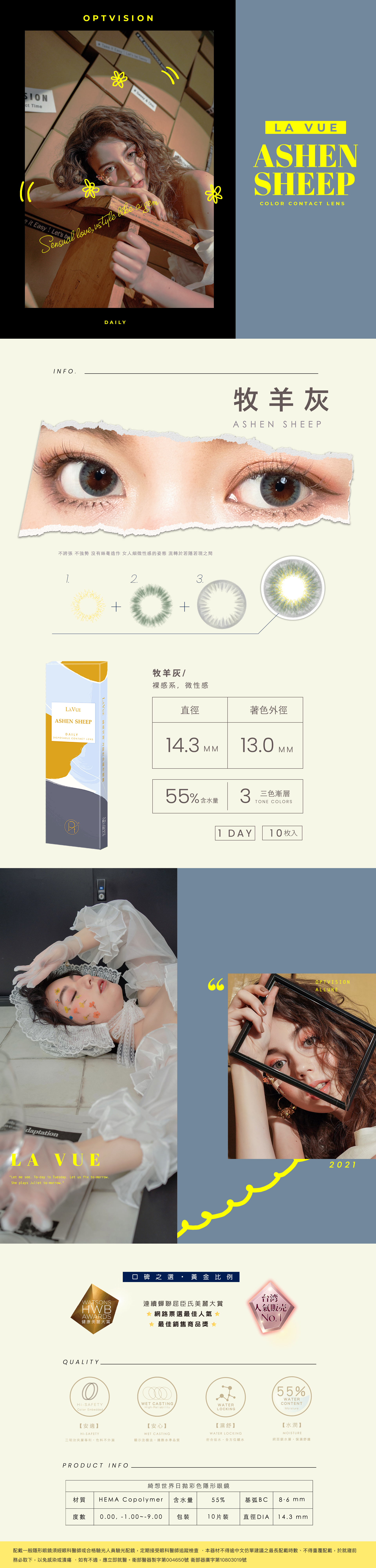 檸檬黃 X星蕨綠 X 岩漿灰堆疊組成,不誇張、不強勢、沒有絲毫造作。灰藍色清混血感流露女人細微性感的姿態,讓淺瞳眼神於若隱若現之間。LA VUE口碑之選,黃金比例。連續蟬聯屈臣氏美麗大賞,網路票選最佳人氣,最佳銷售商品獎。