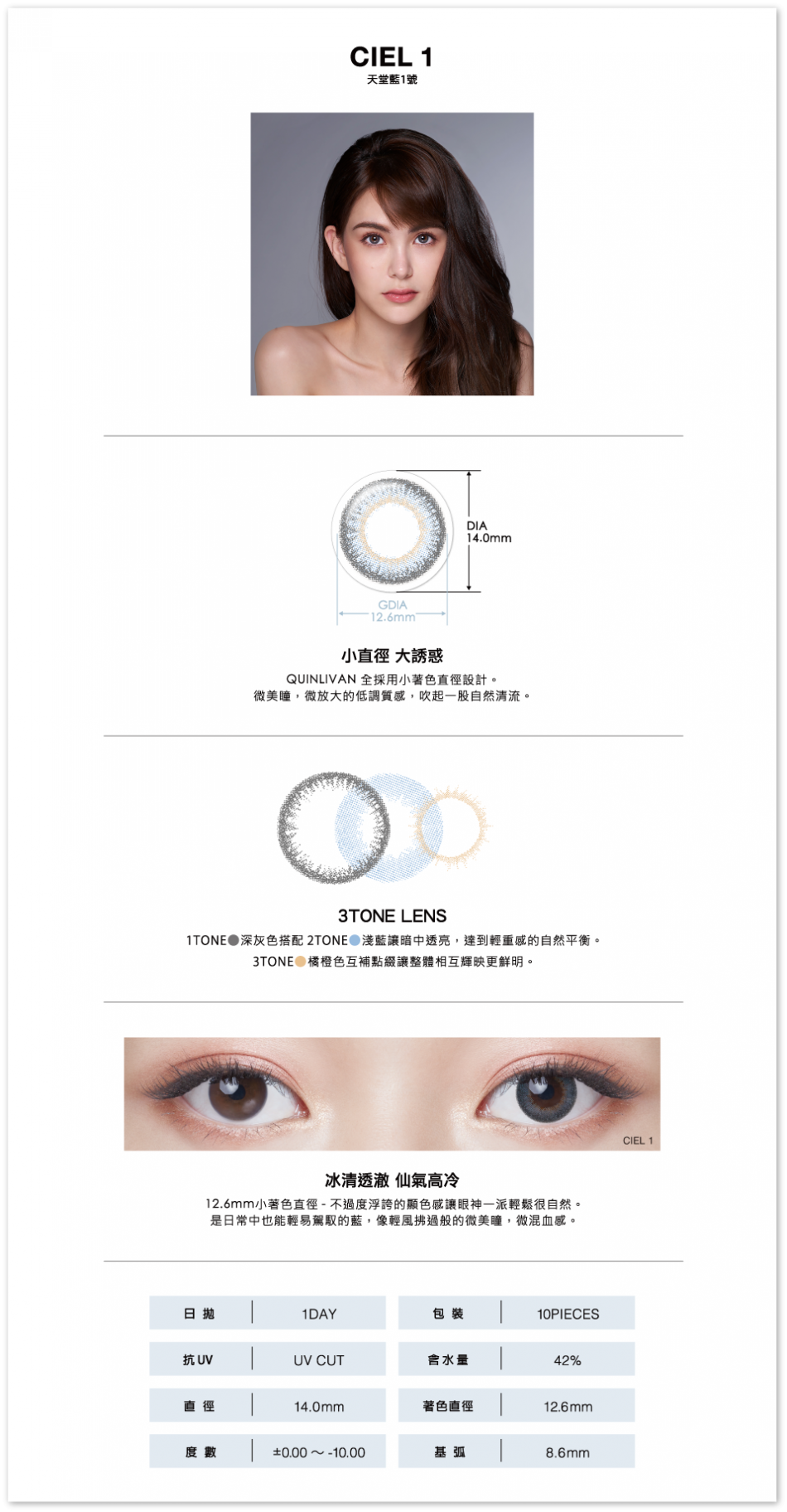 憑藉著對美的敏銳度與自我要求,品牌創始人昆凌以自我英文命名,傾力打造自然典雅兼具時尚簡約的彩色日拋隱形眼鏡品牌「QUINLIVAN」。外圈深灰色搭配裡面淺藍讓暗中透亮,達到輕重感的自然平衡,最內圈橘橙色互補點綴讓整體相互輝映更鮮明!冰清透徹仙氣高冷!12.6mm小著色直徑,不過度浮誇的顯色感讓眼神一派輕鬆很自然。是日常中也能輕易駕馭的藍,像輕風拂過般的微美瞳,微混血感。