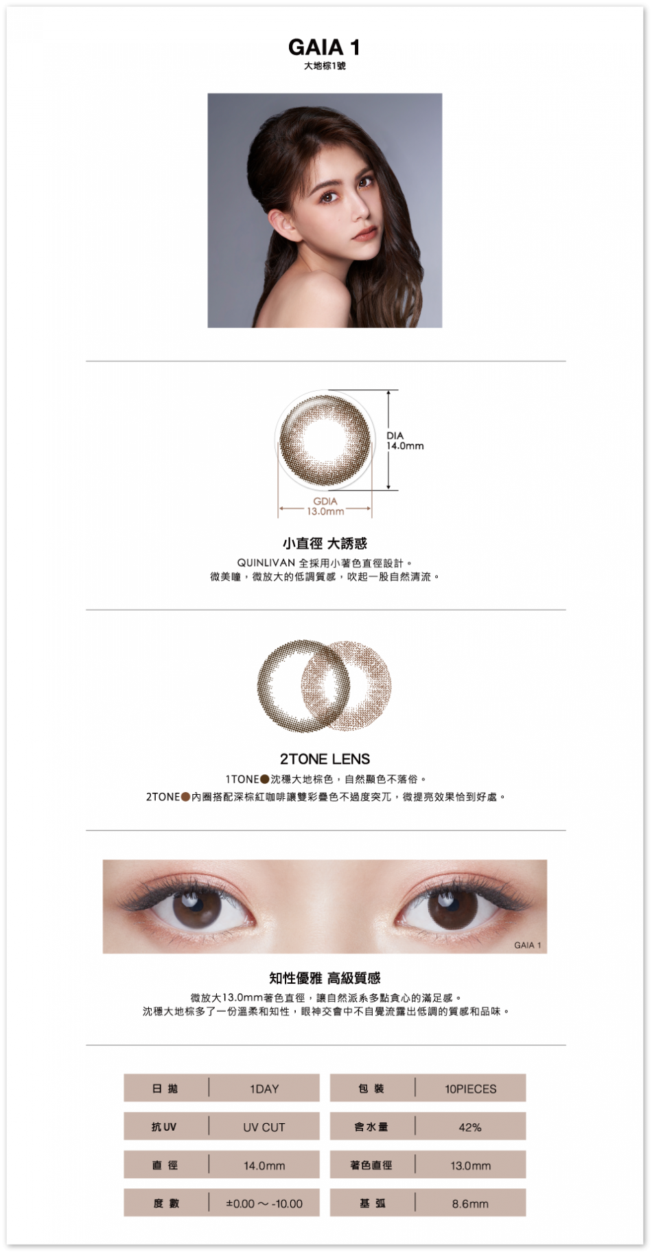 憑藉著對美的敏銳度與自我要求,品牌創始人昆凌以自我英文命名,傾力打造自然典雅兼具時尚簡約的彩色日拋隱形眼鏡品牌「QUINLIVAN」。外圈沉穩大地棕色,自然顯色不落俗,內圈搭配深紅咖啡讓雙彩疊色不過度突兀,微提亮效果恰到好處。知性優雅高級質感!微放大13.0mm著色直徑,讓自然派系多點貪心的滿足感,沉穩大地棕多了一份溫柔和知性,眼神交會中不自覺流露出低調的質感和品味。