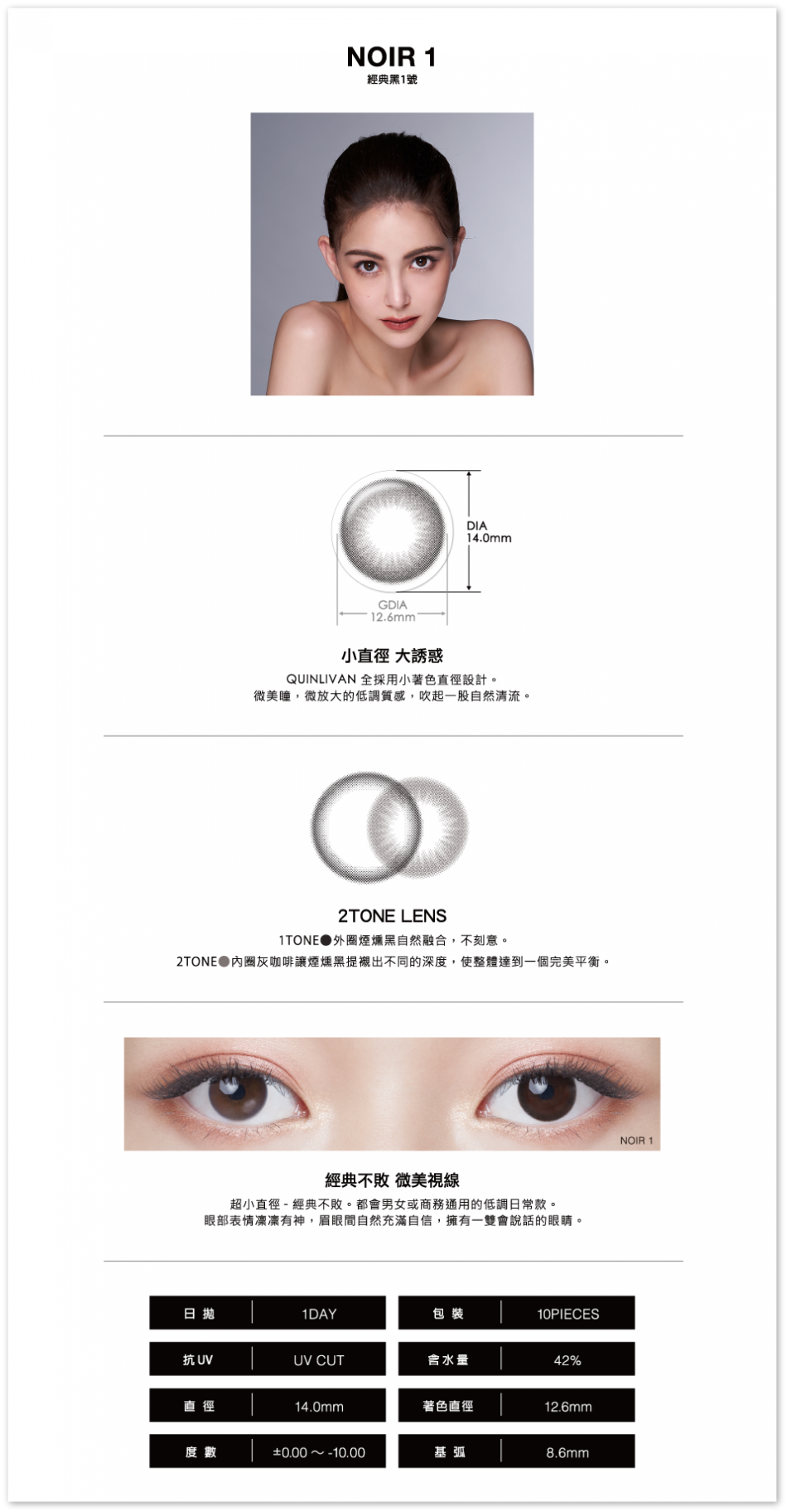 憑藉著對美的敏銳度與自我要求,品牌創始人昆凌以自我英文命名,傾力打造自然典雅兼具時尚簡約的彩色日拋隱形眼鏡品牌「QUINLIVAN」。外圈煙燻黑自然融合,不刻意,內圈灰咖啡讓煙燻黑提襯出不同的深度,使整體達到一個完美平衡。經典不敗微美視線!超小直徑,經典不敗,都會男女或商務通用的低調日常款,眼部表情凜凜有神,眉眼間自然充滿自信,擁有一雙會說話的眼睛。