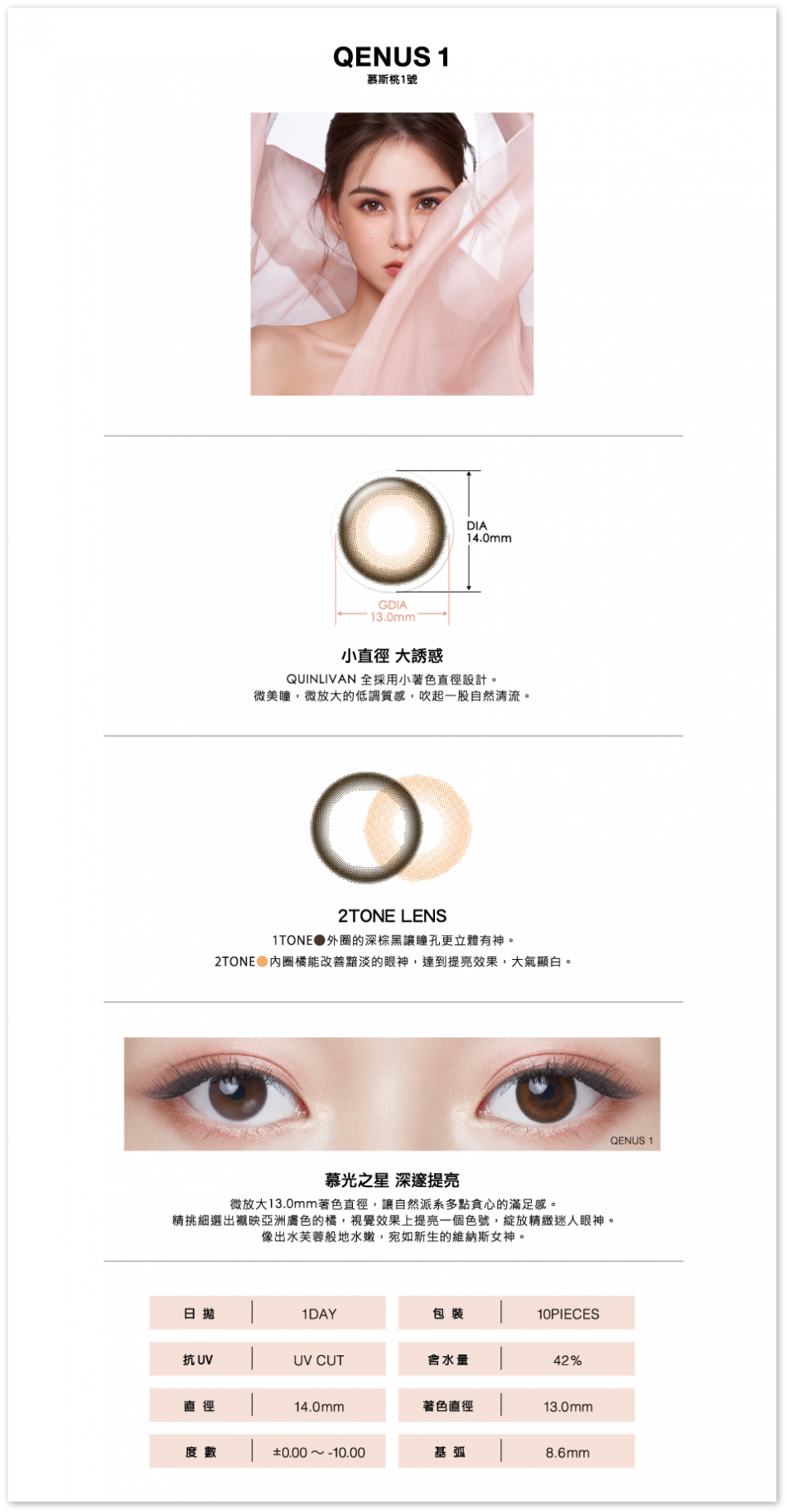 憑藉著對美的敏銳度與自我要求,品牌創始人昆凌以自我英文命名,傾力打造自然典雅兼具時尚簡約的彩色日拋隱形眼鏡品牌「QUINLIVAN」。外圈的深棕黑讓瞳孔更立體有神,內圈橘能改善黯淡的眼神,達到提亮效果,大氣顯白!慕光之星深邃提亮!微放大13.0mm著色直徑,讓自然派系多點貪心的滿足感,精挑細選出襯映亞洲膚色的橘,視覺效果上提亮一個色號,綻放精緻迷人眼神。像出水芙蓉般地水嫩,宛如新生的維納斯女神。