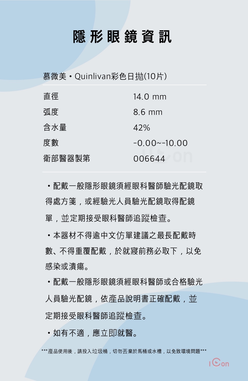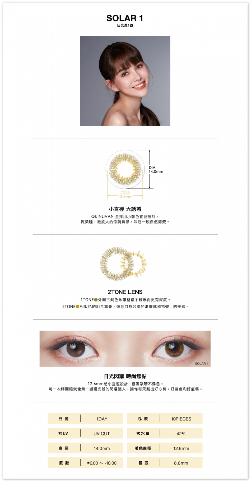 憑藉著對美的敏銳度與自我要求,品牌創始人昆凌以自我英文命名,傾力打造自然典雅兼具時尚簡約的彩色日拋隱形眼鏡品牌「QUINLIVAN」。外圈古銅色系讓整體不輕浮而更有深度,內圈相似色的組合重疊,達到自然和諧的漸層感和視覺上的美感。日光閃耀時尚焦點!12.6mm超小直徑設計,低調吸睛不浮色,每一次睜開眼就像第一道曙光般的耀眼迷人,讓你每天戴出好心情,好氣色和好氣場!