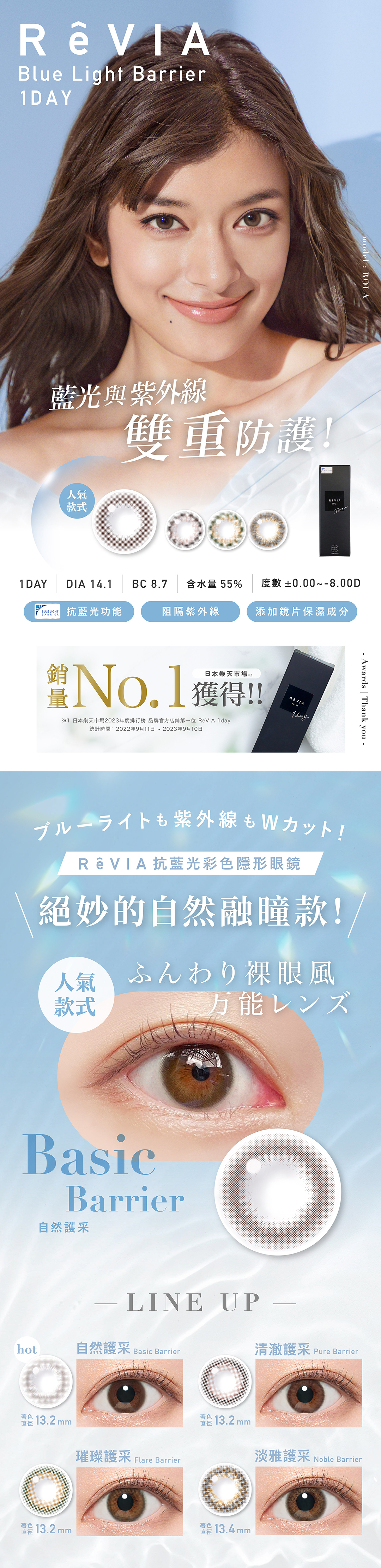 日本樂天市場人氣NO.1品牌「蕾美REVIA」。每款鏡片的瞳色融入度都會配合圖紋而微調,襯托包羅萬有的風格。根據各鏡片的圖紋設計為每款鏡片量身打造著色直徑,打造沒有違和感的自然美眸。璀璨護彩flare barrier橄欖色邊緣配上透明感棕色內環,自然提亮雙眸。